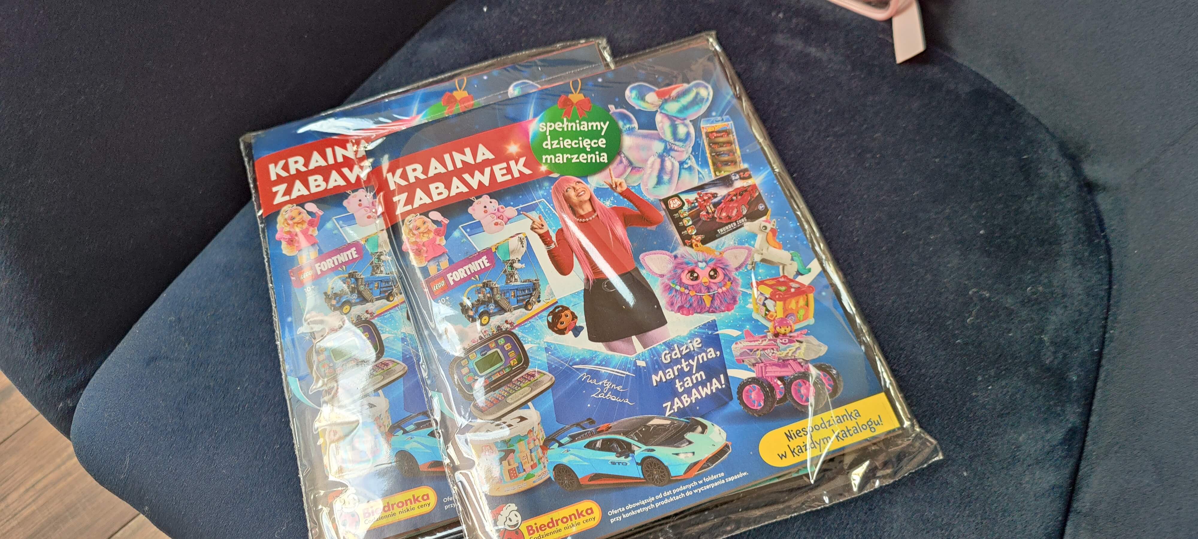 W Biedronce w miejscu gdzie są gazetki, można za darmo zabrać katalog Krainy Zabawek, jest on zafoliowany. W środku znajduje się Listo do Mikołaja sygnowany LEGO oraz zestaw naklejek z Lego.