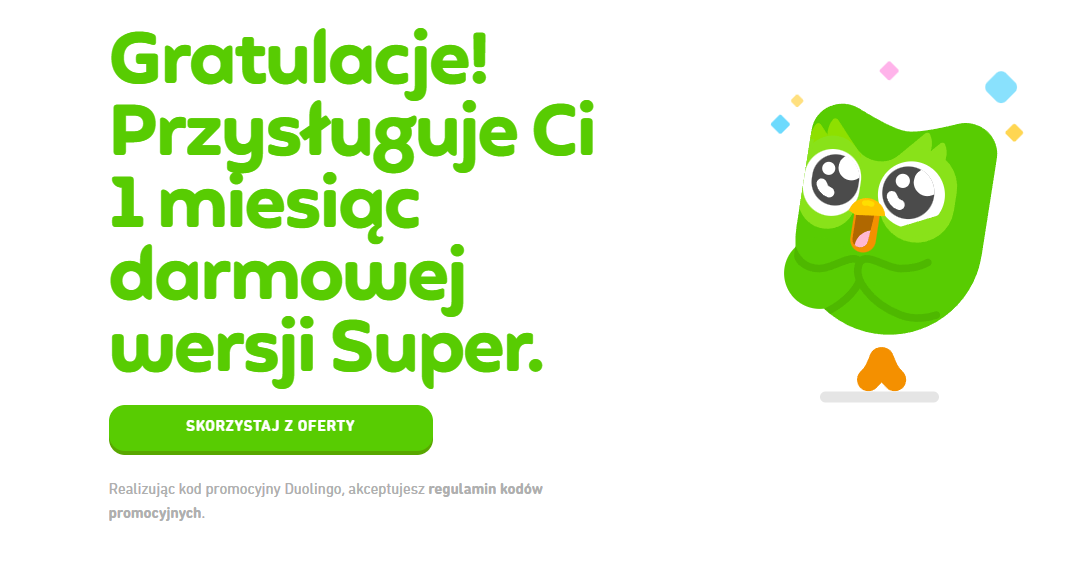 o [Duolingo] Duolingo SUPER / 1 miesiąc za darmo! - kod: DUOBNB2026