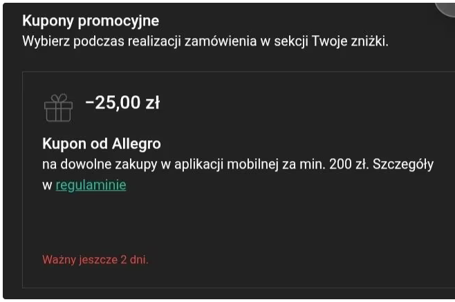o Kupon rabatowy -25/200zł na dowolne zakupy w aplikacji Allegro