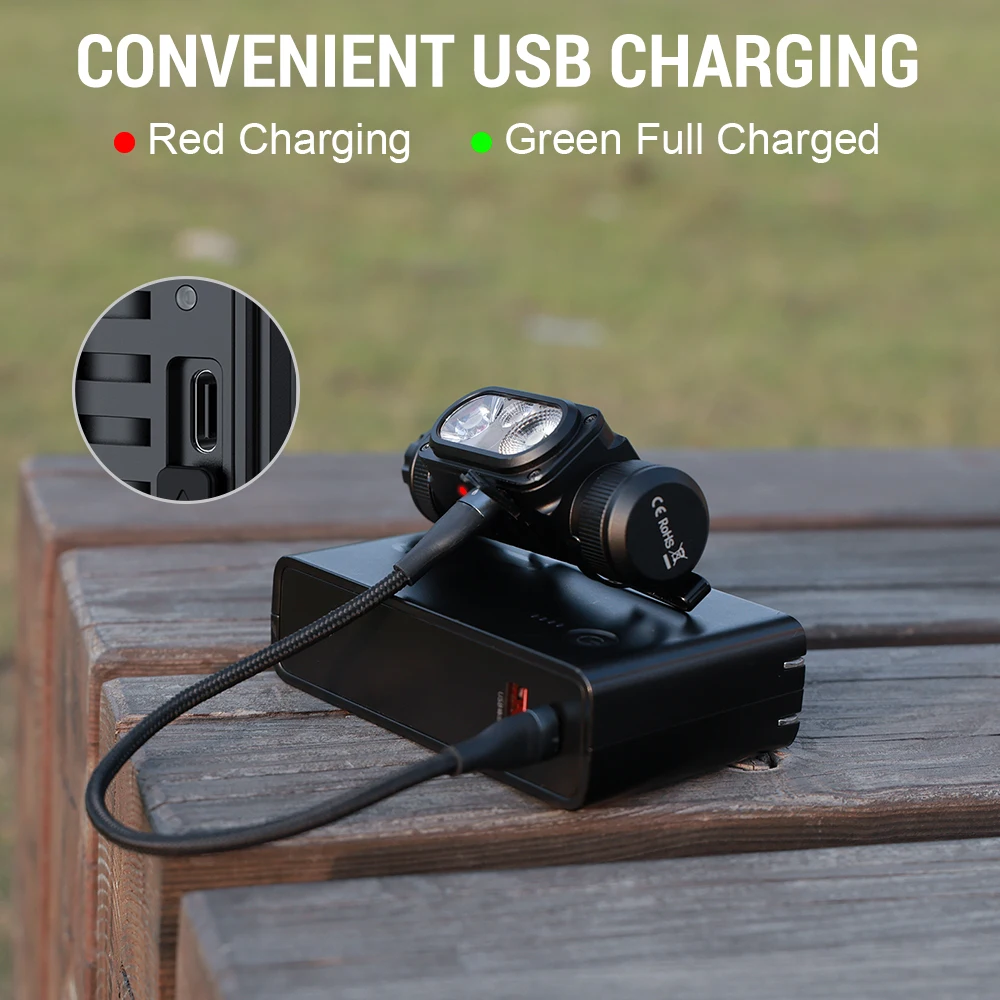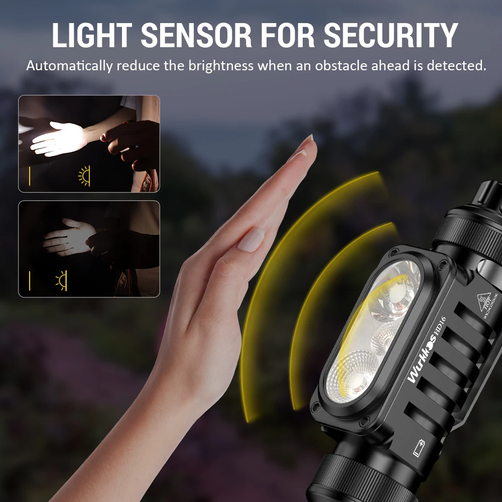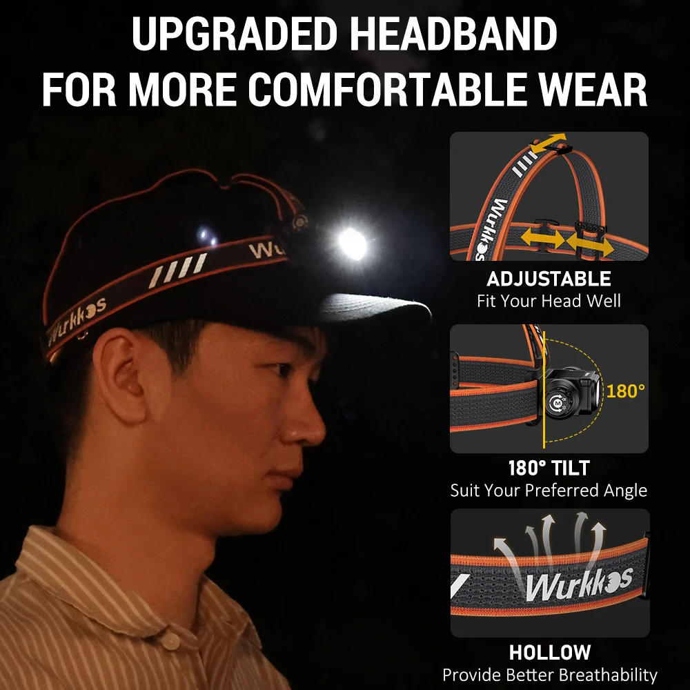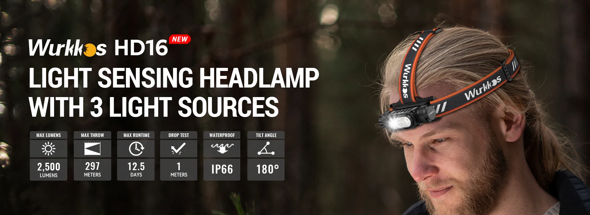 Latarka czołowa Wurkkos HD16 z białym i czerwonym światłem w promocji.