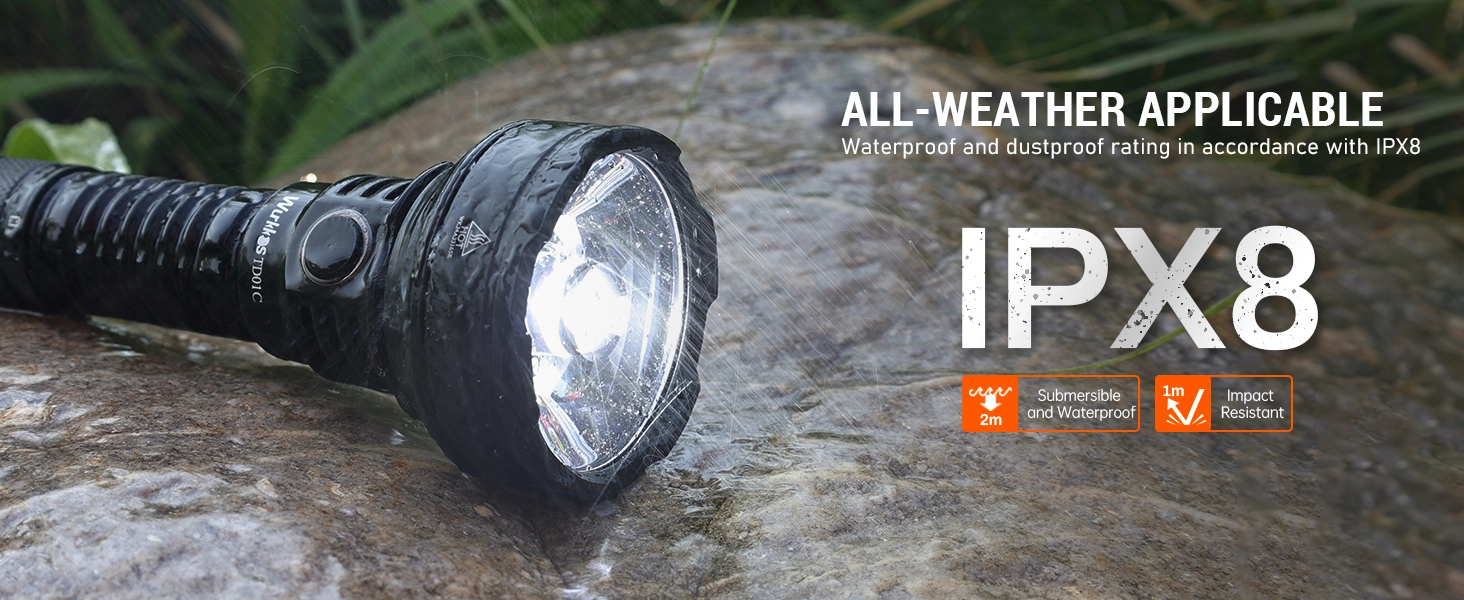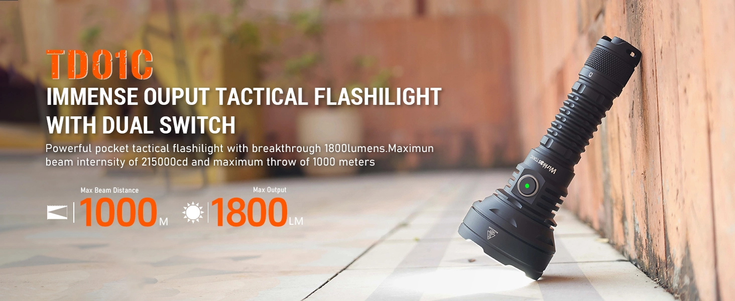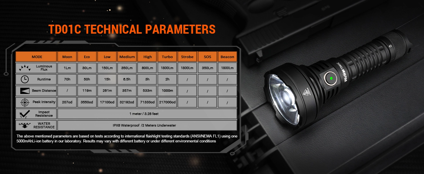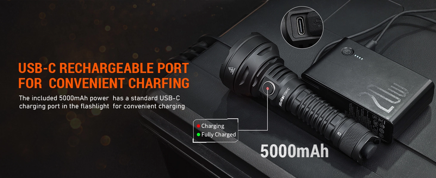 Latarka posiada imponujący zasięg sięgający 1 kilometra, zasilana jest przez akumulator 5000mAh 21700 (w zestawie) i posiada wbudowaną ładowarkę z wejściem USB-C.
