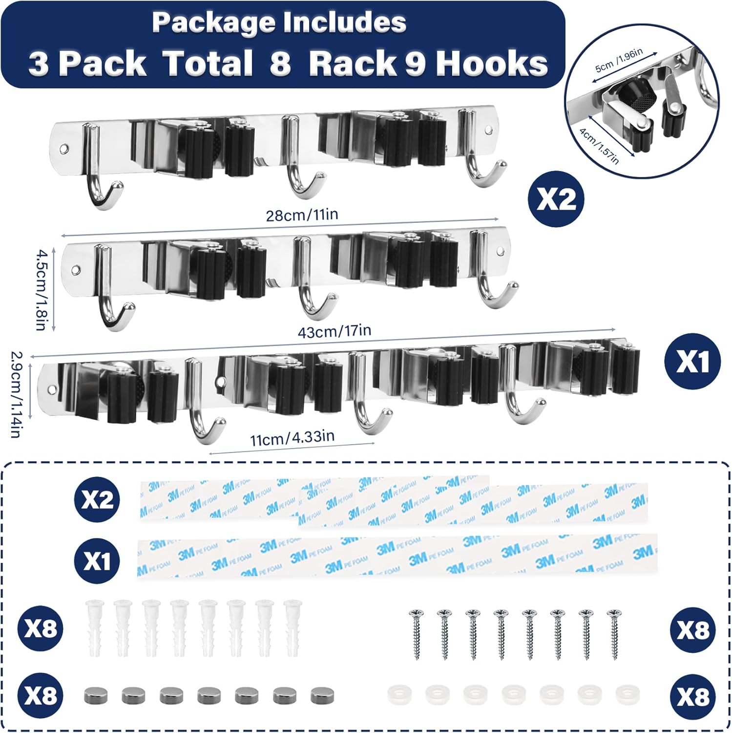 【8 szczelin i 9 haków】3 uchwyty na miotłę: 4 szczeliny, 3 haki + 2 szczeliny, 3 haki, dzięki czemu otrzymasz łącznie 8 szczelin i 9 haczyków. Oszczędność miejsca dzięki kompaktowym rozmiarom i mocnym możliwościom organizacyjnym.
