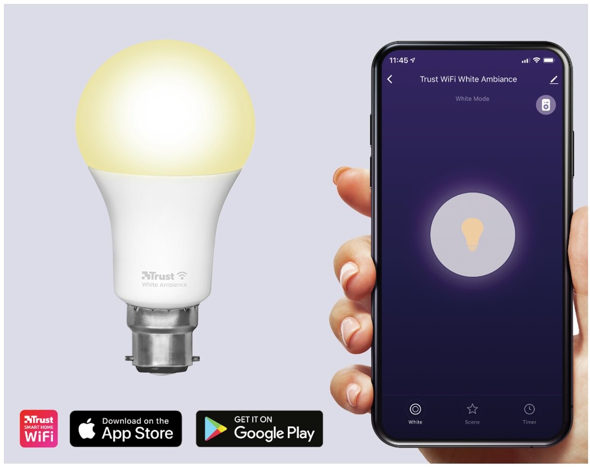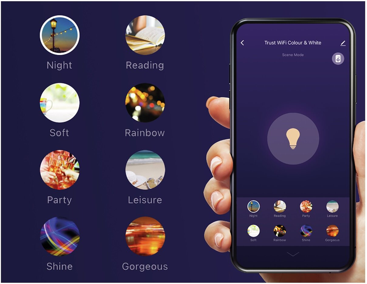 W inteligentnych żarówkach Trust możesz wybrać poziom temperatury światła od 1800 do 6500K. Możesz również skorzystać z gotowych rozwiązań takich jak: światło nocne, światło do czytania, światło imprezowe, światło błyszczące i wiele innych!