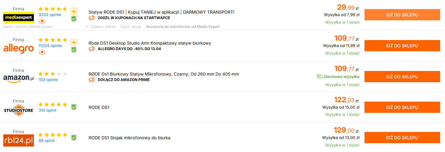 W zestawie znajduje się statyw RODE DS1 oraz dokumentacja.