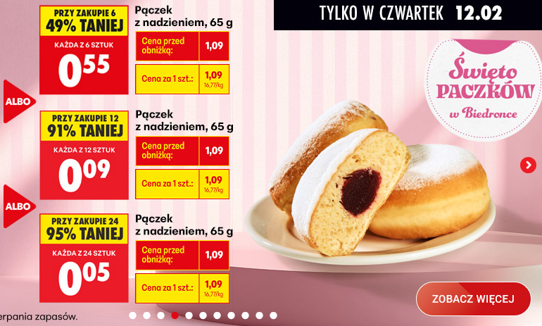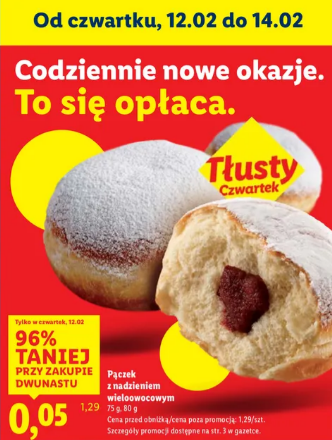 Najtańsze pączki według gazetki na Tłusty Czwartek 2026 będzie miał Lidl. Za najtańszego pączka zapłacimy 0,09 gr. Pewnie nawet Biedronka tego nie przebije 😃