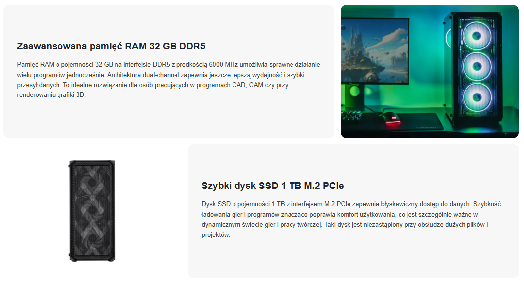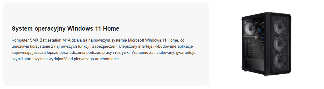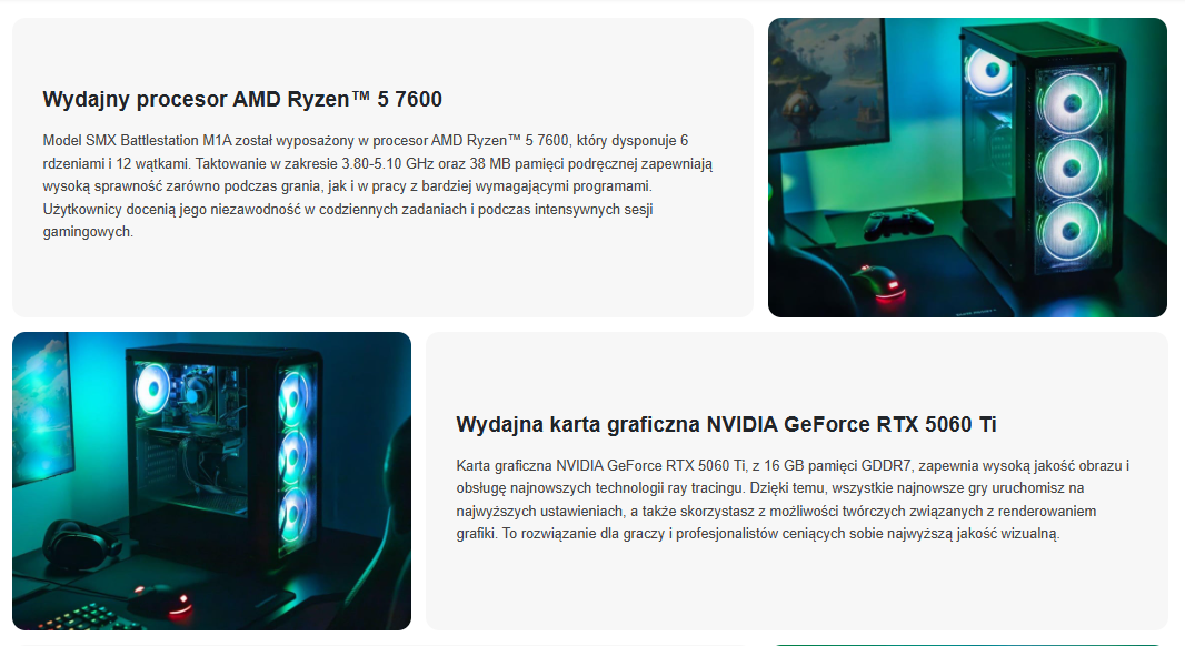 Prezentujemy wyjątkowy komputer SMX Battlestation M1A, który łączy mocne parametry do gier z możliwościami zaawansowanej pracy twórczej. Wyposażony w nowoczesny procesor AMD Ryzen™ 5 7600 oraz kartę graficzną NVIDIA GeForce RTX 5060 Ti, gwarantuje płynne działanie najnowszych tytułów i programów projektowych. Dzięki obsłudze technologii DLSS 4, korzystanie z tego sprzętu to prawdziwa przyjemność dla miłośników grafiki komputerowej.