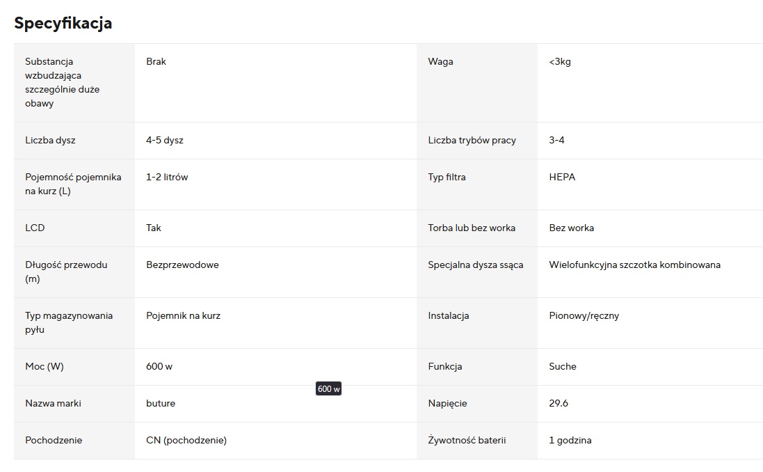 o Odkurzacz ręczny bezprzewodowy BUTURE VC90 600W 65KPA