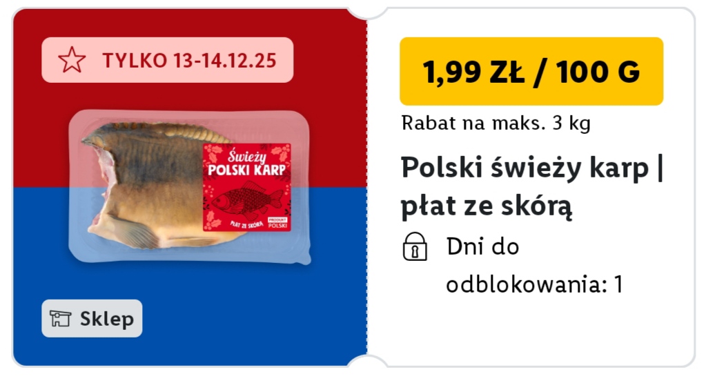 Karp z lidla w cenie 25zł za kg, rabat na max 3kg. Cena po aktywowaniu kuponu w aplikacji lidla i zeskanowaniu jej przy kasie 😉 w dniach 13-14 grudnia.