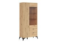 Wyjątkowe wzornictwo to efekt zastosowania laminatu o podwyższonej odporności na zarysowania w ciepłym odcieniu dąb artisan z widocznymi słojami i sękami. Spokojną kolorystykę przełamują czarne dodatki – uchwyty i skośne, podwyższone nóżki, dodatkowo dodające witrynie lekkości i ułatwiające sprzątanie. Całość wpisuje się w wiele aranżacji, zarówno surowy styl industrialny czy loftowy, jak i przytulny wystrój boho.
