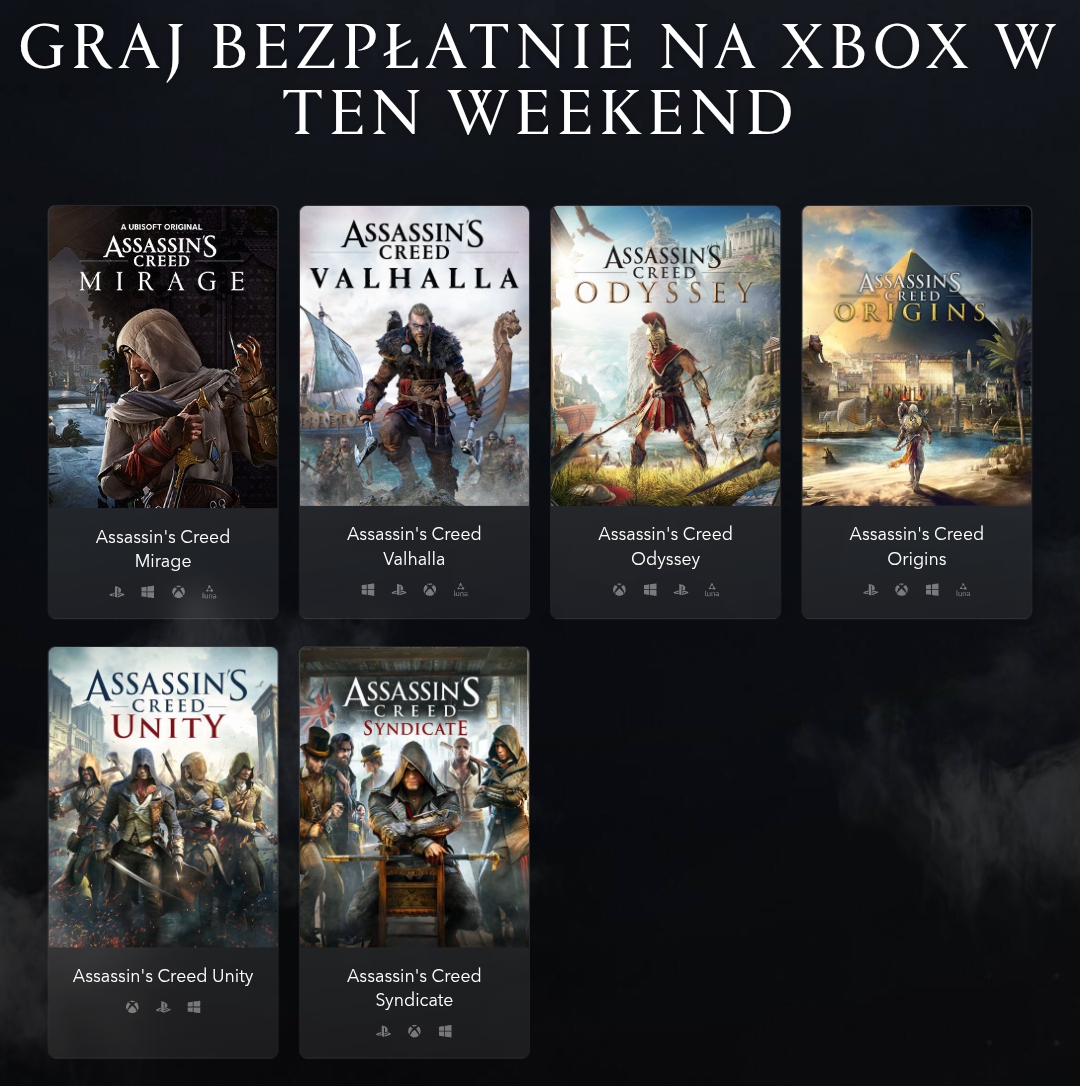 Wśród dostępnych gier znajdują się: Assassin's Creed Unity, Syndicate, Origins, Odyssey, Valhalla oraz wprowadzenie do Assassin's Creed Mirage!